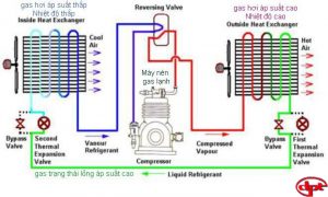 – Sau đó quá trình ngược lại gas ở trạng thái hơi thấp áp suất thấp được nén lên áp suất cao. Sau đó được giải nhiệt hoàn toàn tạo thành lỏng hoàn thành 1 vòng chu trình kín